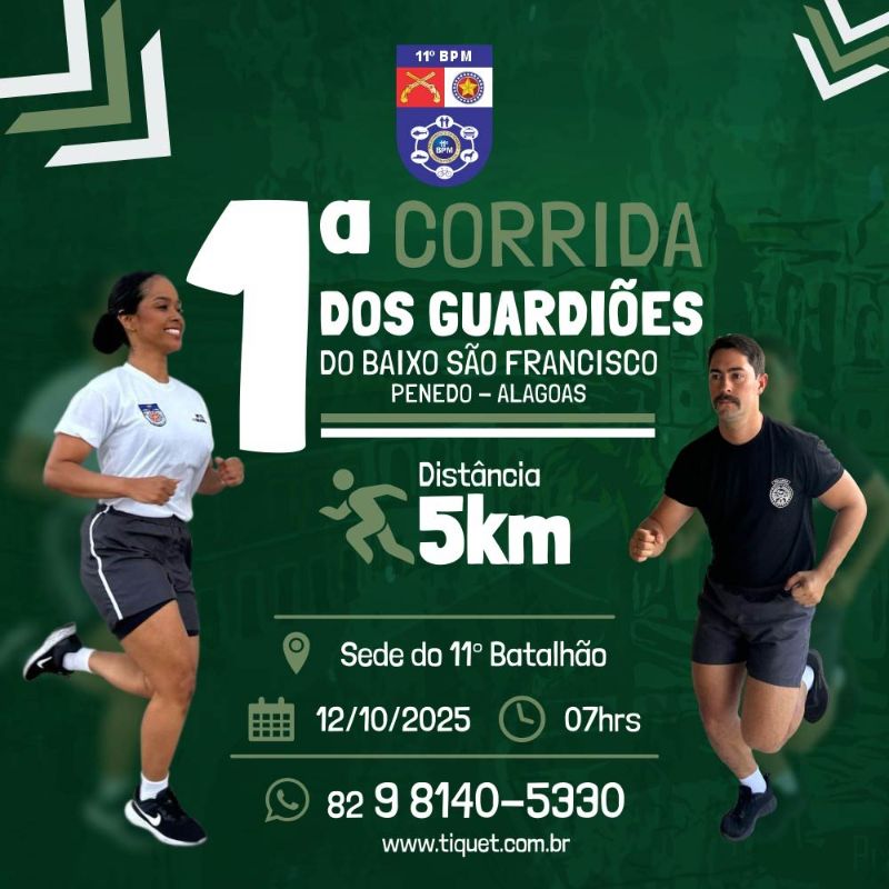 No dia 12 de outubro, Penedo será palco da 1ª Corrida dos Guardiões do Baixo São Francisco, organizada pelo 11º Batalhão de Polícia Militar. Com percurso de 5 km, a prova terá concentração a partir das 6 horas e largada marcada para as 7 horas, na sede do 11º BPM.