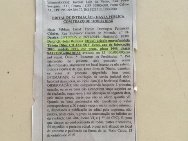 3 de novembro de 2015 Pré-candidato a prefeito de Porto Calvo tem bem tomado pela Justiça por falta de pagamento