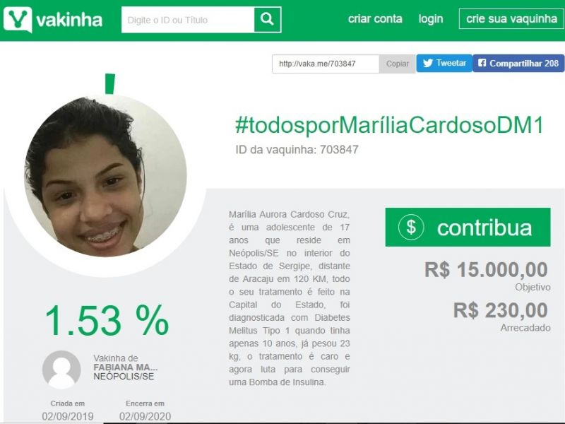 3 de setembro de 2019 Adolescente cria vaquinha para conseguir aparelho que controla doença crônica e autoimune
