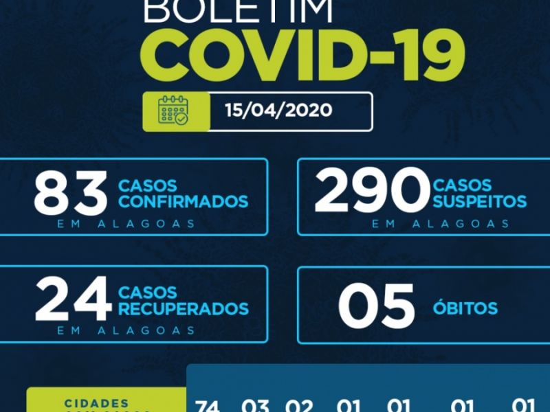 Alagoas tem 83 casos confirmados de coronavírus, 24 curados e cinco mortes