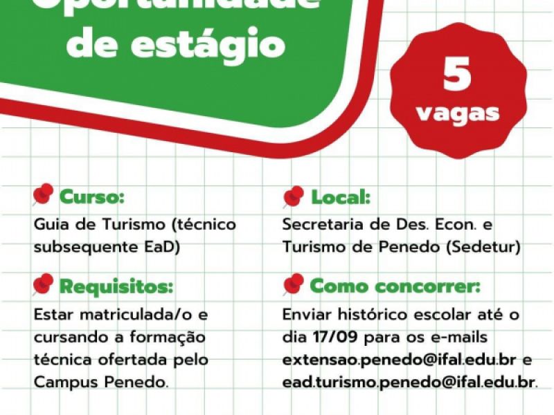 15 de setembro de 2021 Em parceria com Sedetur, Instituto Federal de Alagoas está com oportunidade de estágio em Penedo