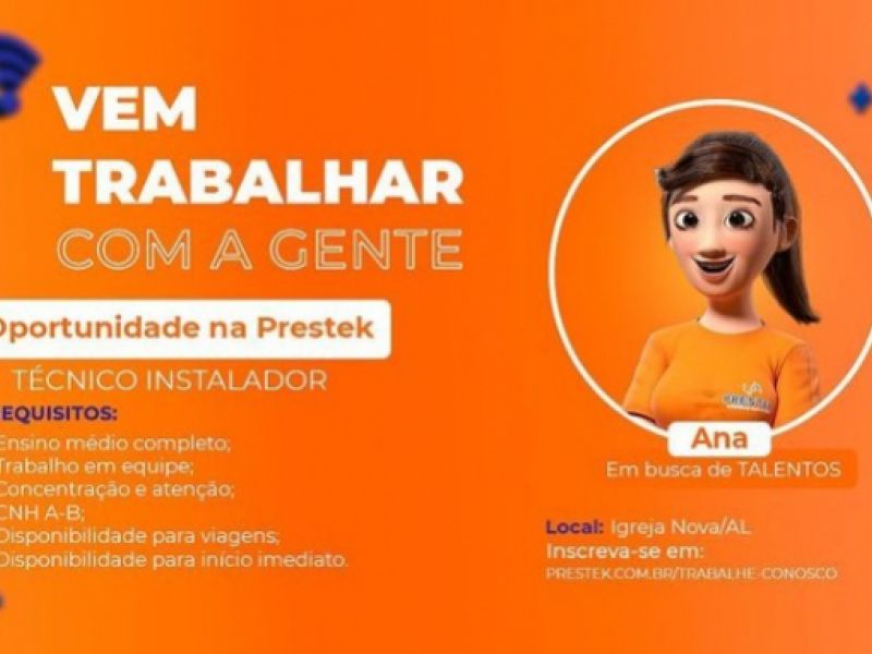 29 de setembro de 2021 Prestek Internet divulga oportunidade de trabalho para a cidade de Igreja Nova