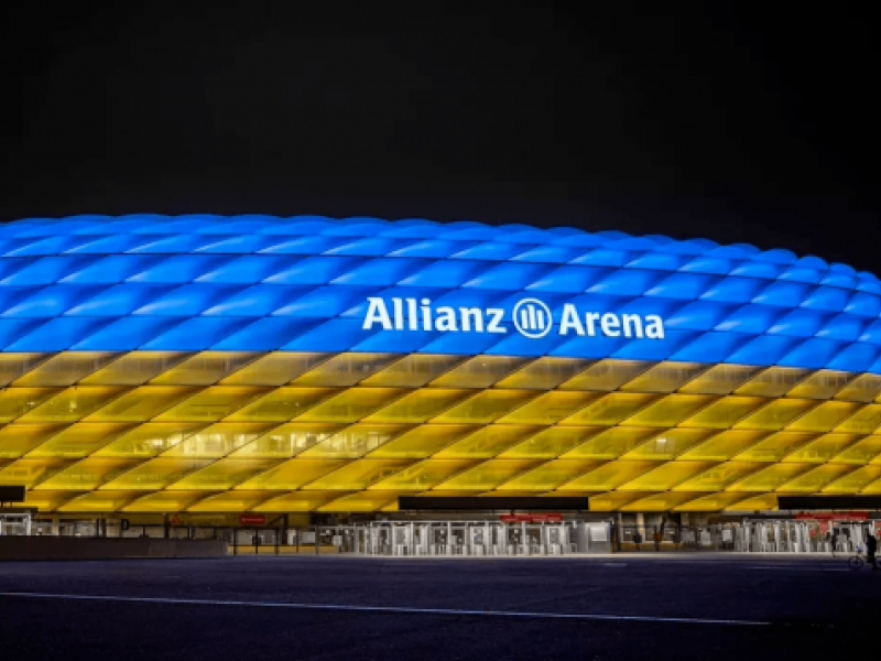 26 de fevereiro de 2022 Em apoio à Ucrânia, Bayern de Munique ilumina Arena Allianz com cores do país