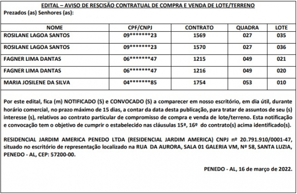 16 de março de 2022 Edital – aviso de rescisão contratual de contrato de compra e venda de lote/terreno