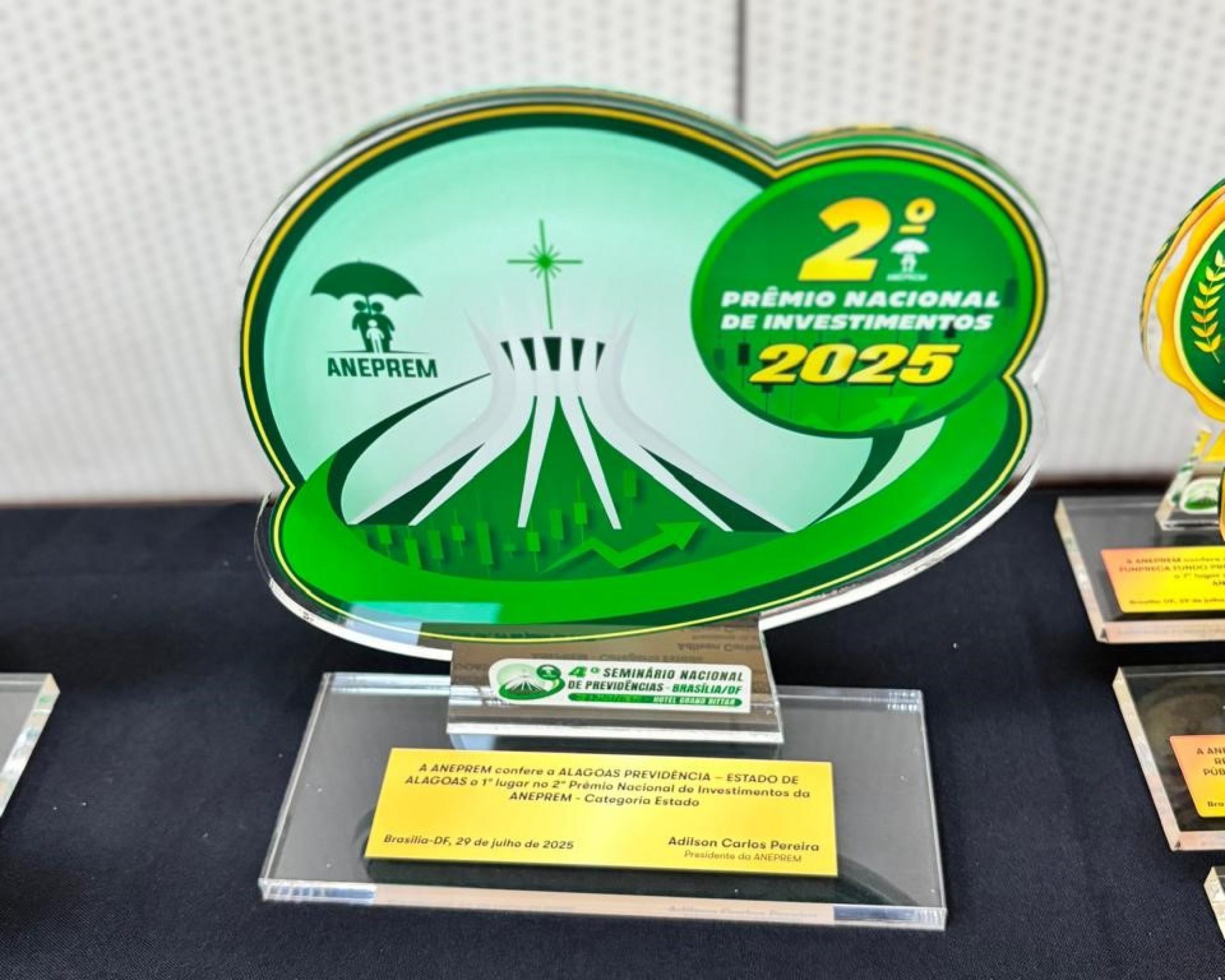 A Alagoas Previdência conquistou o 1º lugar na categoria Investimentos, pela excelência na administração dos recursos destinados à aposentadoria dos servidores públicos estaduais. Na mesma cerimônia, o presidente da autarquia, Roberto Moisés, foi homenageado com o Selo Gestor Ouro, distinção concedida pela Aneprem a dirigentes que se destacam por boas práticas de governança e resultados consistentes na gestão previdenciária.