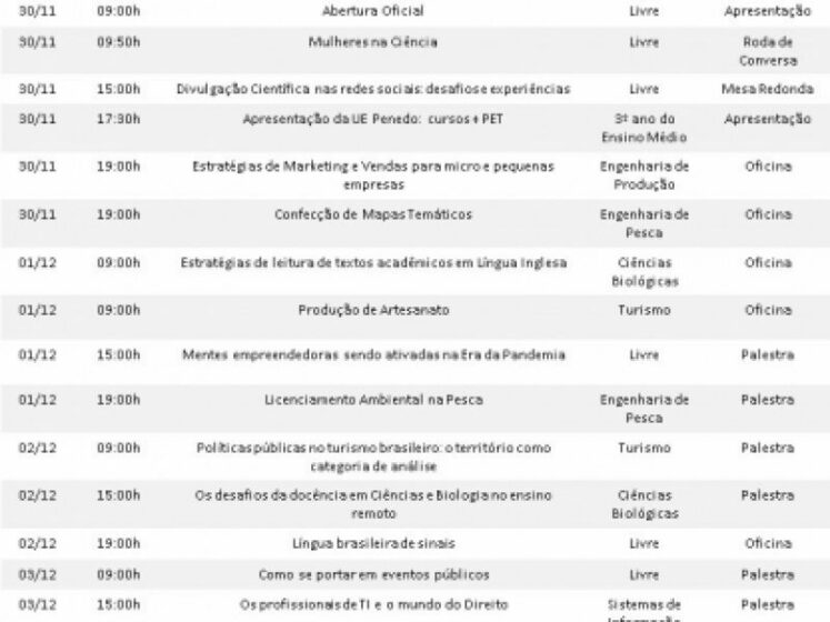O evento inicia neste segunda-feira (30/11) e vai até a quinta-feira (04/12). Estando repleta de oficinas, e em suas palestras, terá os melhores de cada área, oportunizando um melhor entendimento e contribuição educacional ao participante. Para participar mesmo não sendo aluno alvo, basta fazer a inscrição no link abaixo. Parabéns ao PET, seus professores e alunos.