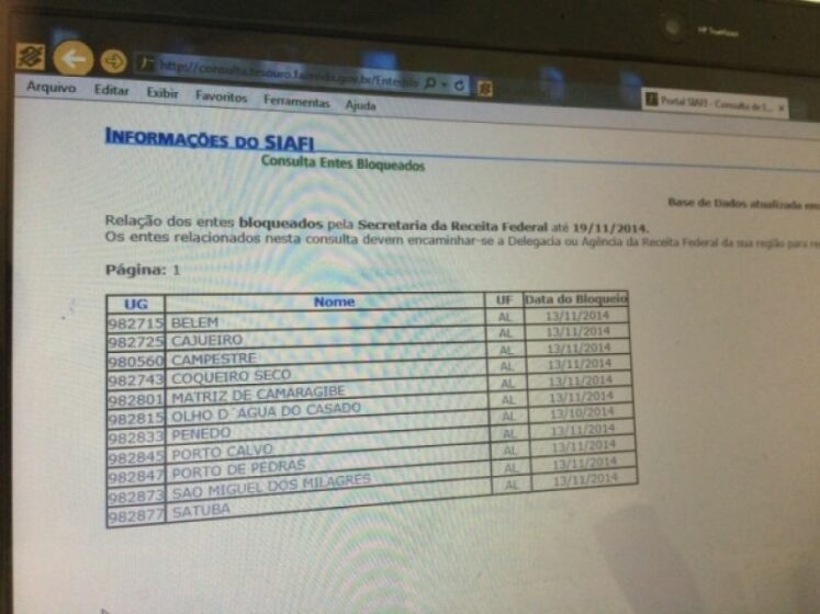 Além de Penedo estão bloqueados os repasses para os municípios de Satuba, São Miguel dos Milagres, Porto de Pedras, Porto Calvo, Olho d´Água do Casado, Matriz de Camaragibe, Coqueiro Seco, Campestre, Cajueiro e Belém.