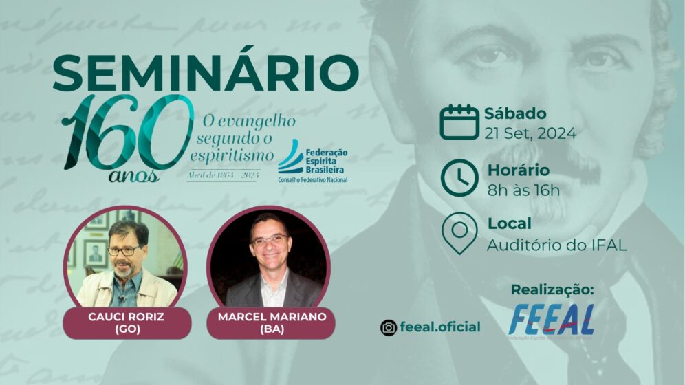 Em comemoração aos 160 anos de lançamento da terceira obra da codificação espírita (1864), a FEEAL – Federação Espírita do Estado de Alagoas promove o Seminário ‘160 anos O Evangelho Segundo o Espiritismo’, com a presença de Cauci Roriz (GO) e Marcel Mariano (BA), no auditório do IFAL (Campus Maceió), R. Mizael Domingues, 530 – Centro, Maceió/AL, dia 21 de setembro de 2024, das 8h às 16h. Ingressos disponíveis pelo Sympla e na sede da FEEAL.