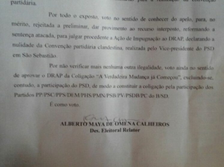Diante da decisão proferida pelo relator do processo, o desembargador Alberto Maya de Omena Calheiros, o PSD que compunha chapa com Zé Pacheco, teve sua convenção municipal anulada, algo que faz cair tanto o vice quanto os vereadores que estavam na disputa junto ao ex-prefeito que tenta mais uma vez conduzir os destinos políticos de São Sebastião.
