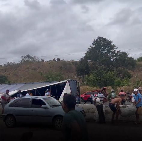 Após o tombamento, parte da carga ficou espalhada pelo acostamento da rodovia e acabou sendo levada por populares que passavam pelo local.