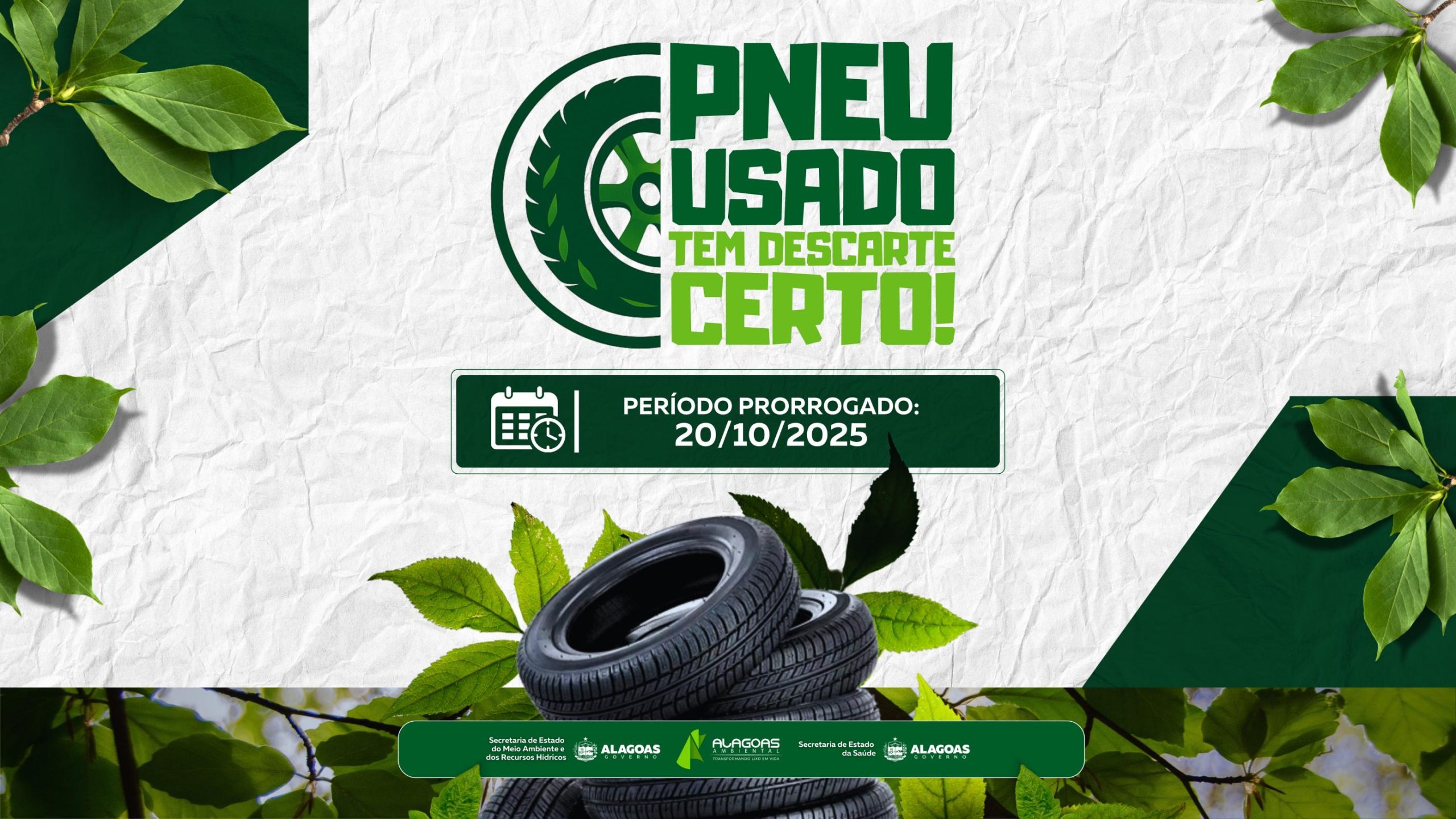 Realizada em parceria com a empresa Alagoas Ambiental e com as secretarias municipais, a iniciativa já vem registrando recordes de recolhimento. Segundo o secretário de Estado de Meio Ambiente e Recursos Hídricos, Judson Cabral, o novo prazo possibilita maior adesão dos municípios e amplia o alcance da mobilização. “Estamos muito felizes em dar continuidade ao recolhimento de pneus que já não estão em uso. Essa é uma ação de saúde pública e de cuidado com o meio ambiente que vem batendo recordes, mostrando a força dessa campanha. Com a prorrogação, mais municípios poderão participar e somar a essa iniciativa”, afirmou.