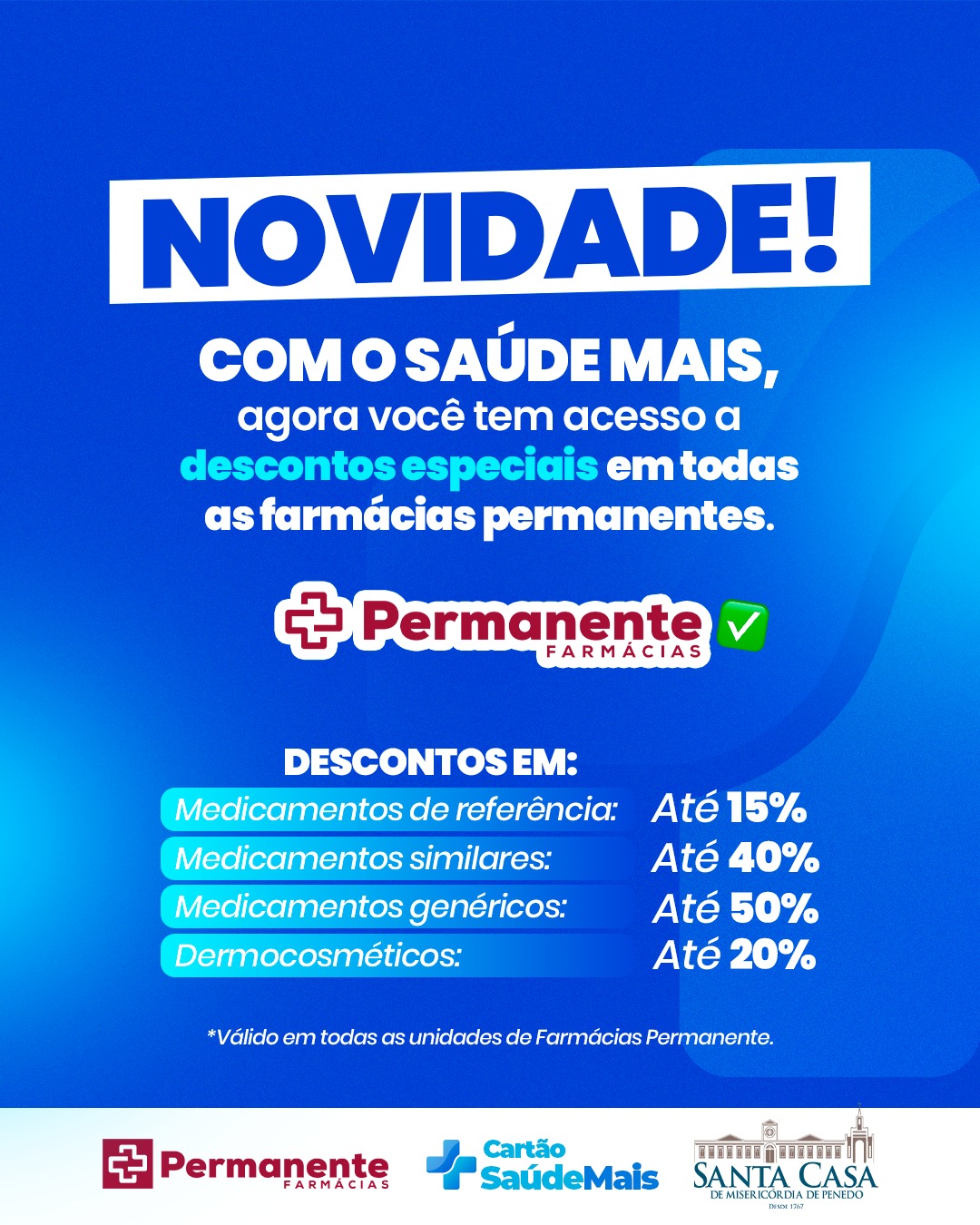 A Santa Casa de Misericórdia de Penedo acaba de ampliar os benefícios oferecidos à população. A partir de agora, todos os usuários do Cartão Saúde Mais passam a contar com descontos especiais em todas as unidades das Farmácias Permanente, sem exceção. A parceria garante redução no valor de medicamentos de referência, similares, genéricos e também em dermocosméticos, com percentuais que chegam a até 50%.