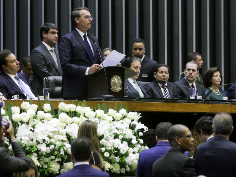 1 de janeiro de 2019 Ao tomar posse, Bolsonaro pede apoio ao Congresso para ?restaurar e reerguer? o Brasil