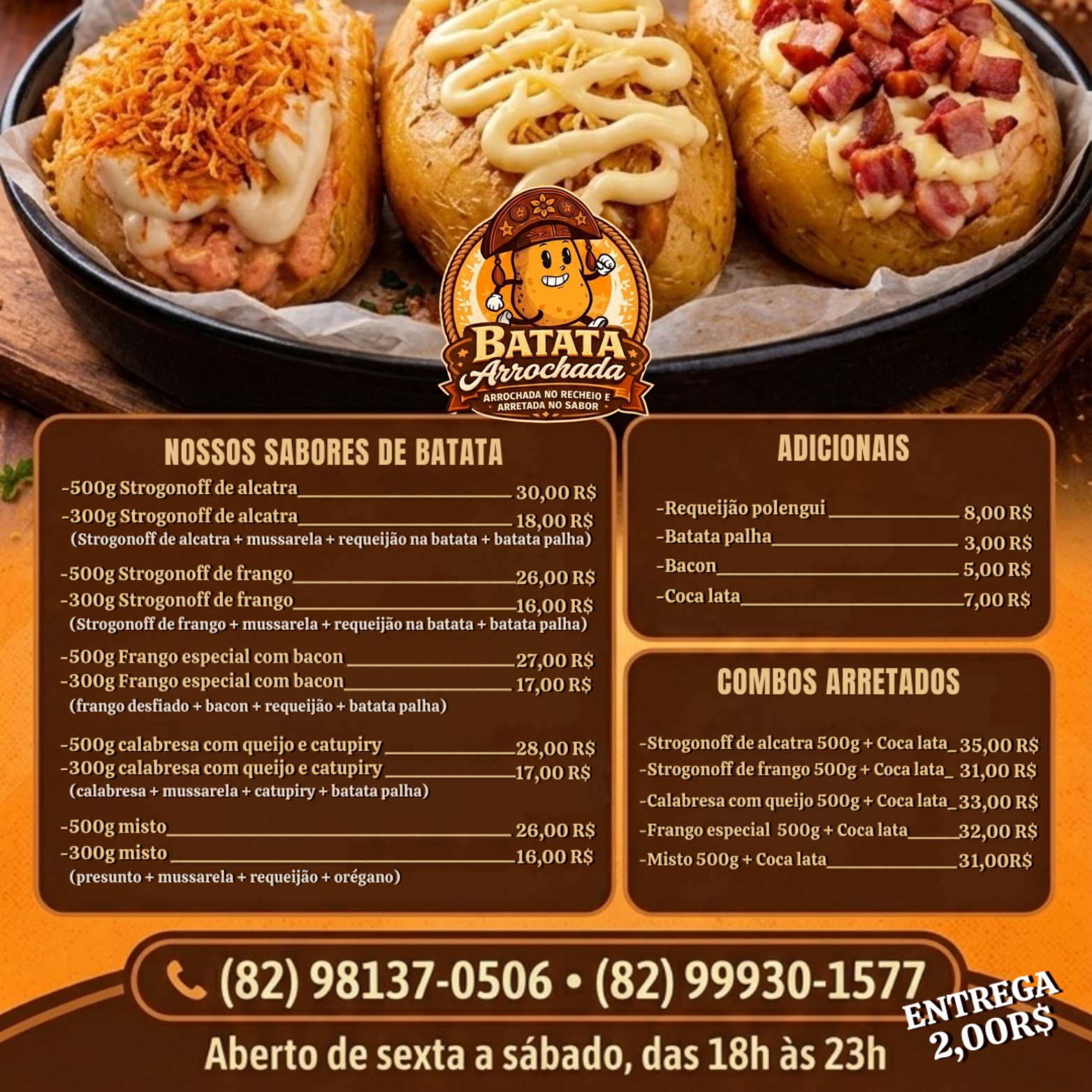 O empreendimento funciona de sexta a domingo, das 18h às 23h, com porções a partir de R$ 16. Para quem prefere receber em casa, a taxa de entrega custa apenas R$ 2. Os pedidos podem ser feitos pelos telefones (82) 9 8137-0506 ou (82) 9 9930-1577.