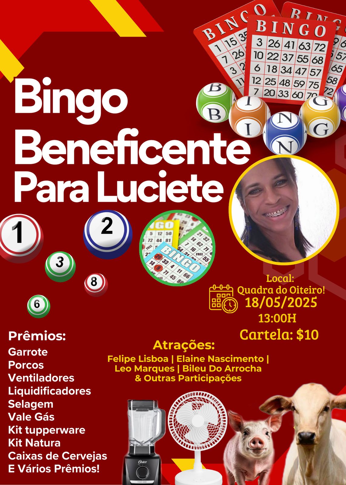 Para concorrer aos diversos prêmios, basta adquirir uma cartela pelo valor de R$ 10,00. E tem mais: para animar a tarde, haverá show com Felipe Lisboa, Elaine Nascimento, Leo Marques, Bileu do Arrocha e outras participações especiais.
