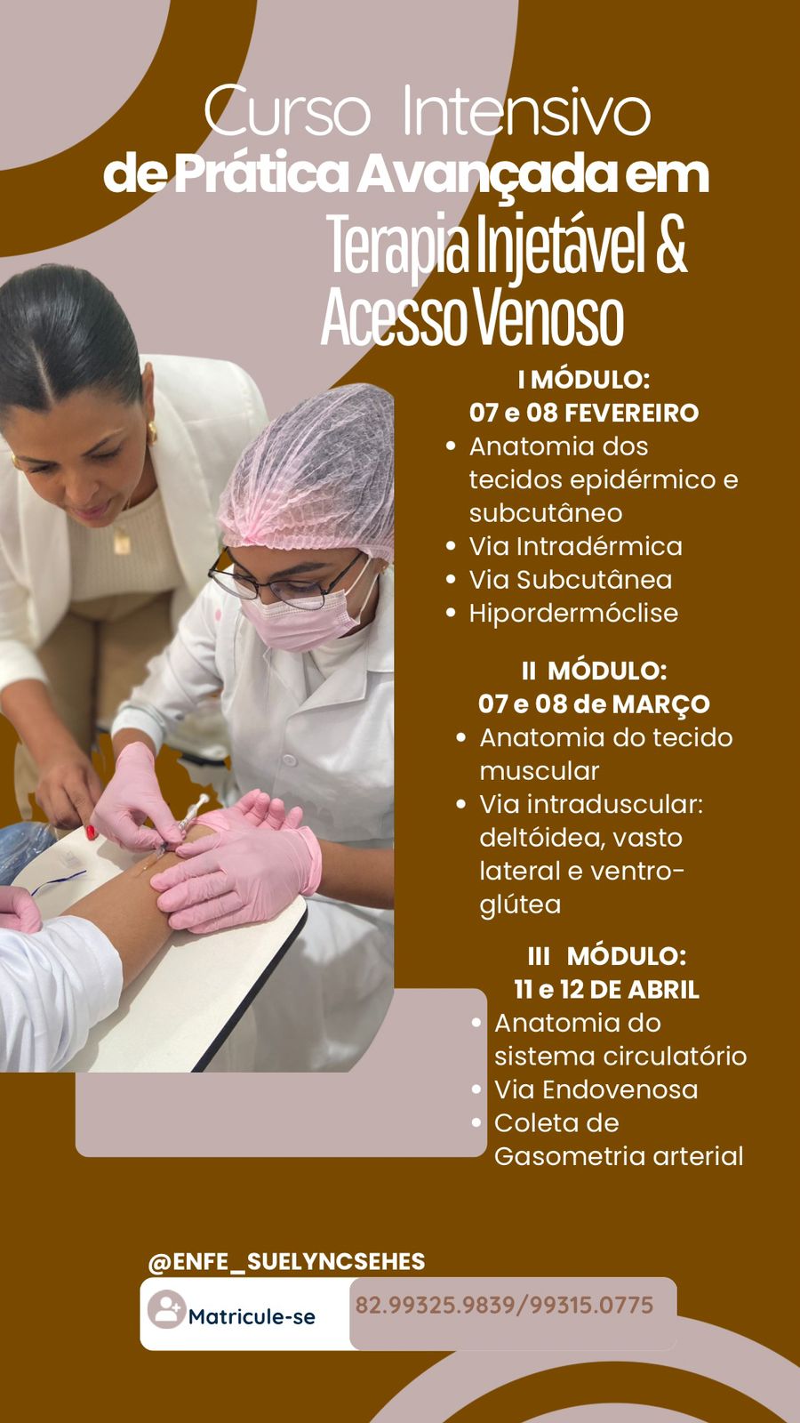Já o segundo módulo, marcado para 7 e 8 de março, será dedicado à anatomia do tecido muscular e às técnicas de aplicação intramuscular nas regiões deltóidea, vasto lateral e ventroglútea.