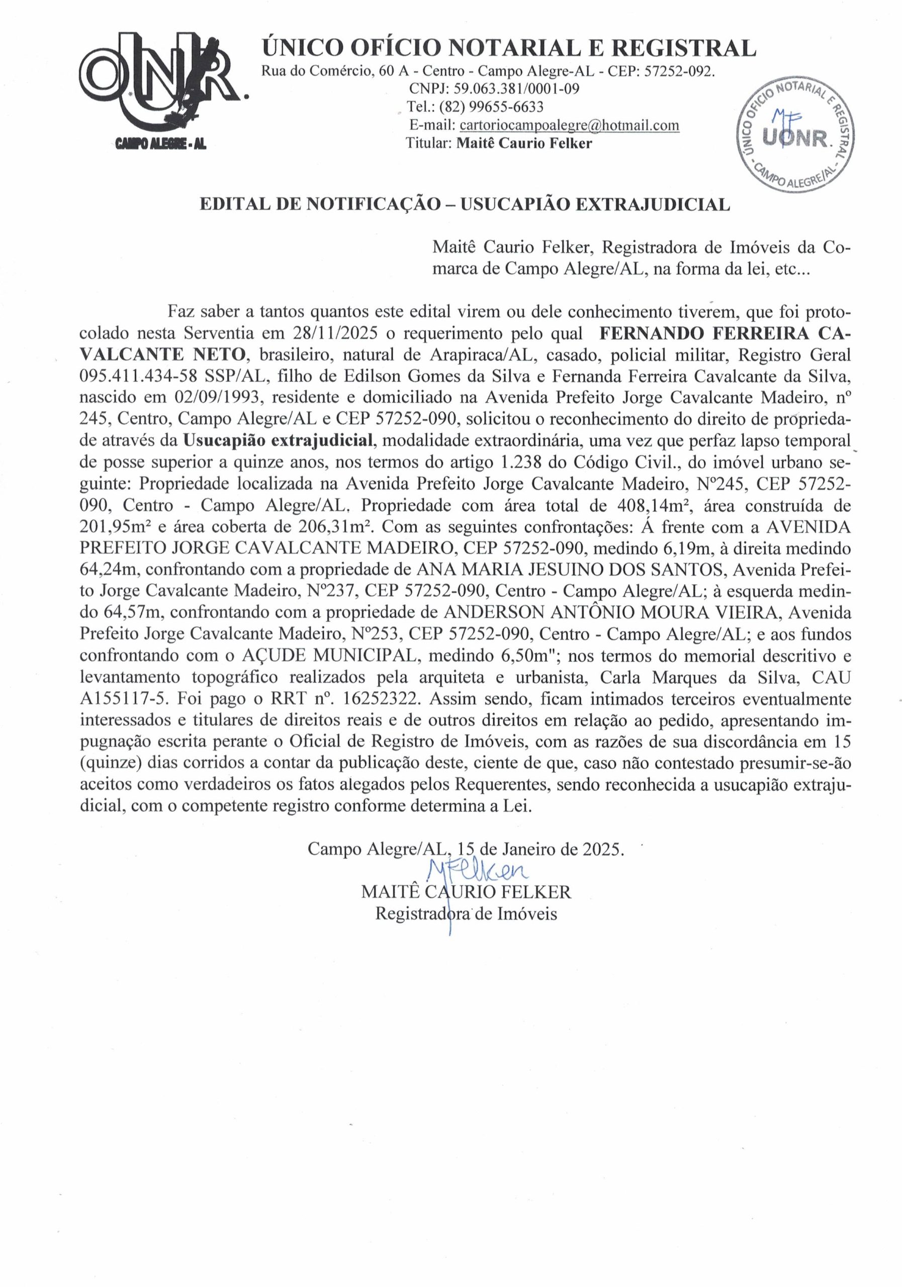 Edital de ciência/notificação de pedido de usucapião extrajudicial – Fernando Ferreira Cavalcante Neto 20 de janeiro de 2026 às 15:38 Redação
