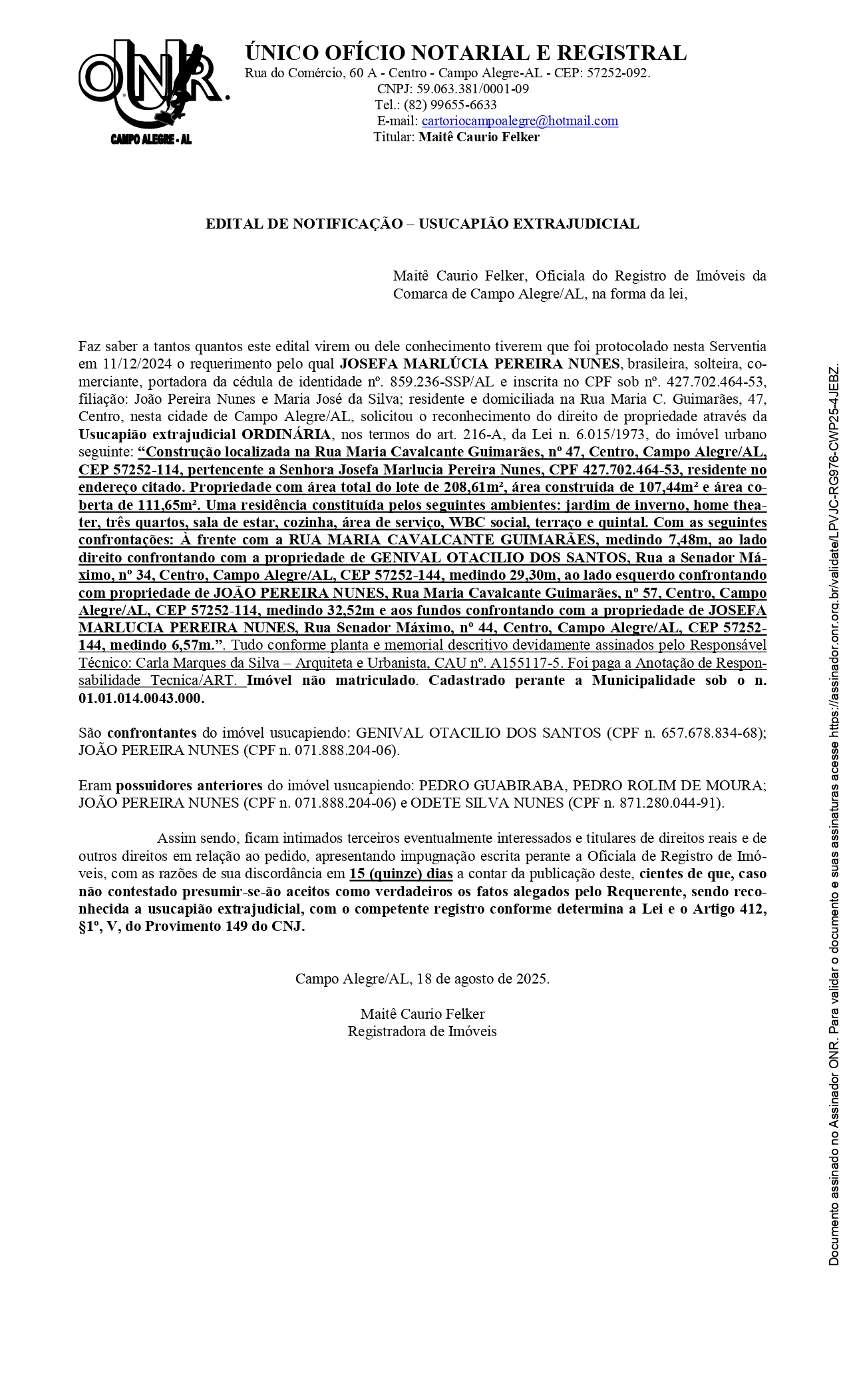 Edital de ciência/notificação de pedido de usucapião extrajudicial – Josefa Marlucia Pereira Nunes 5 de setembro de 2025 às 09:52 Redação