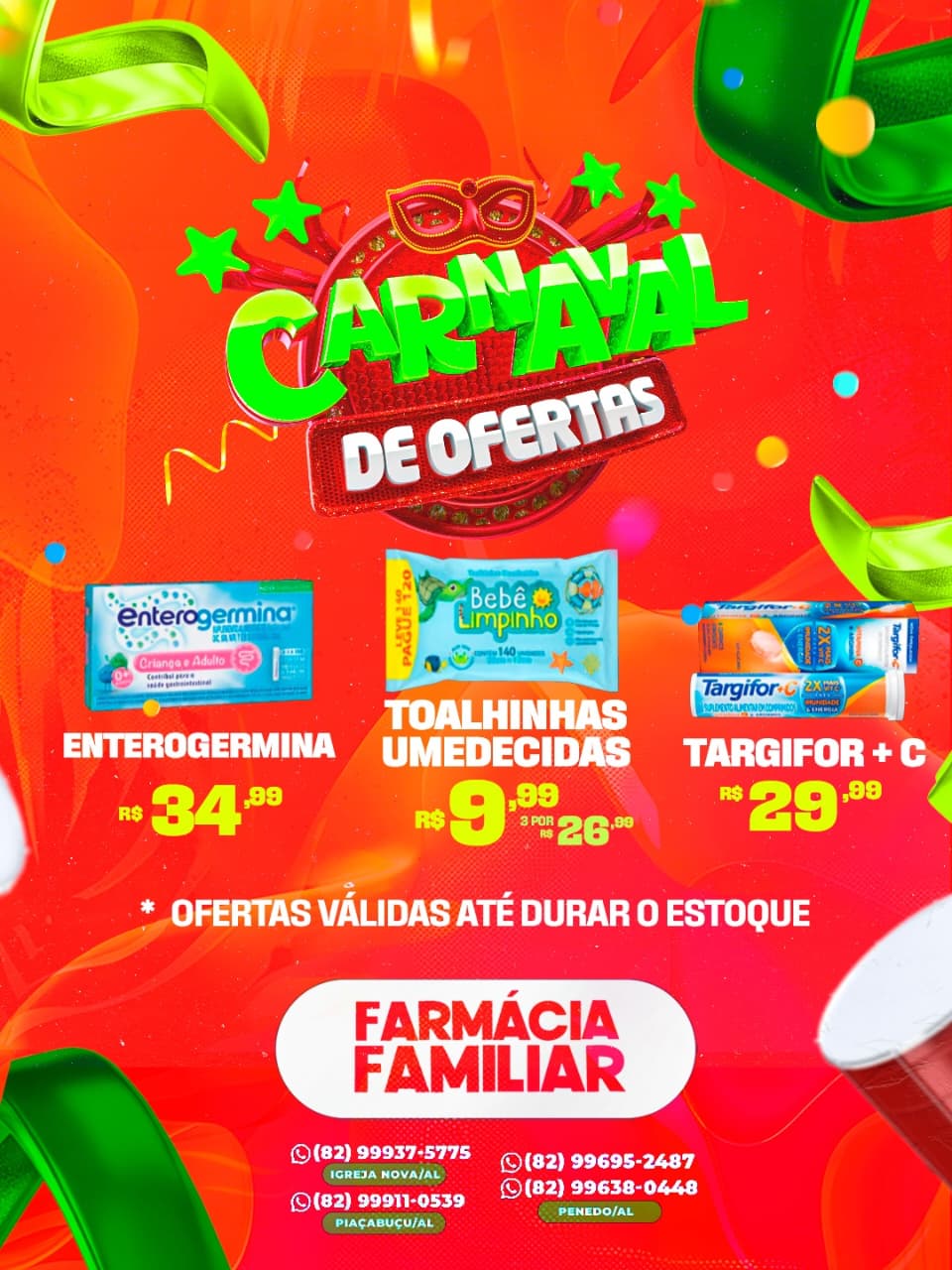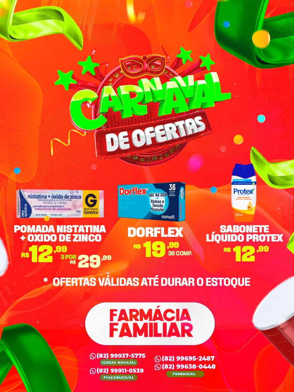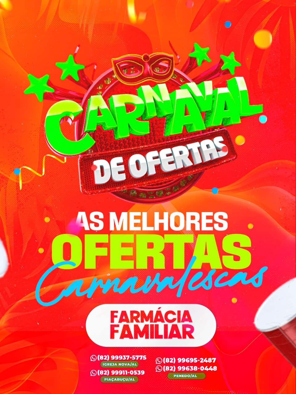 O clima de Carnaval chegou também à Farmácias Familiar, em Penedo, que está promovendo um verdadeiro Carnaval de Ofertas, com preços especiais em diversos produtos e descontos que podem chegar a 50%, válidos de sexta a segunda-feira. A campanha reúne medicamentos, itens de perfumaria, produtos infantis e equipamentos de saúde, além de serviços gratuitos para a população.