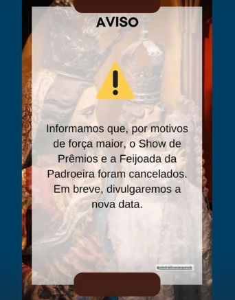 Porém, por motivos de força maior, a “Feijoada da Padroeira” e o show de prêmios foram cancelados, e o informe aos fiéis foi feito por meio das redes sociais. Em breve, uma nova data será divulgada pela organização.