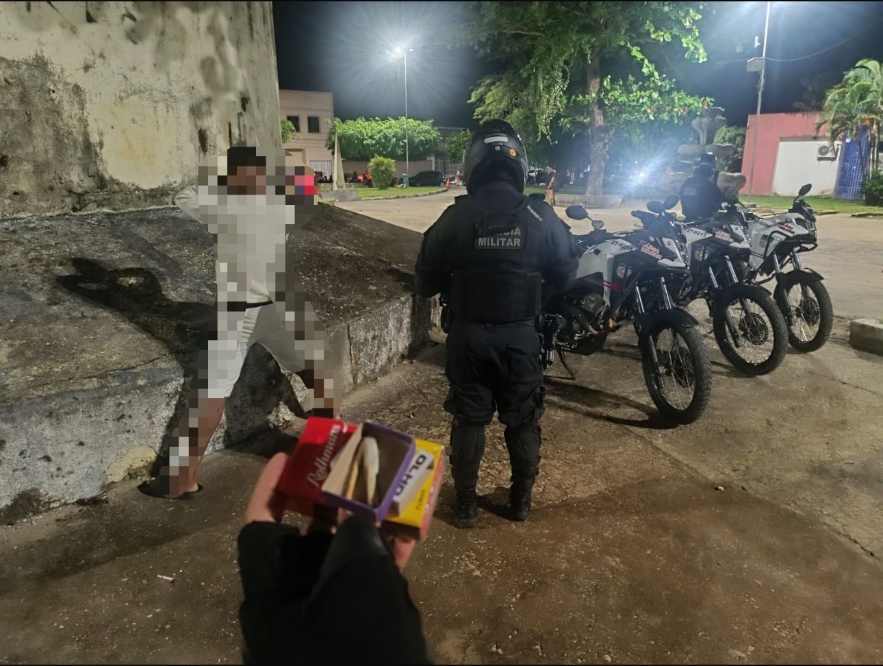De acordo com a polícia, ao perceber a aproximação da equipe, o homem mudou repentinamente de direção e arremessou uma carteira de cigarro com uma das mãos e um pequeno objeto com a outra. A atitude levantou suspeita e motivou a abordagem.