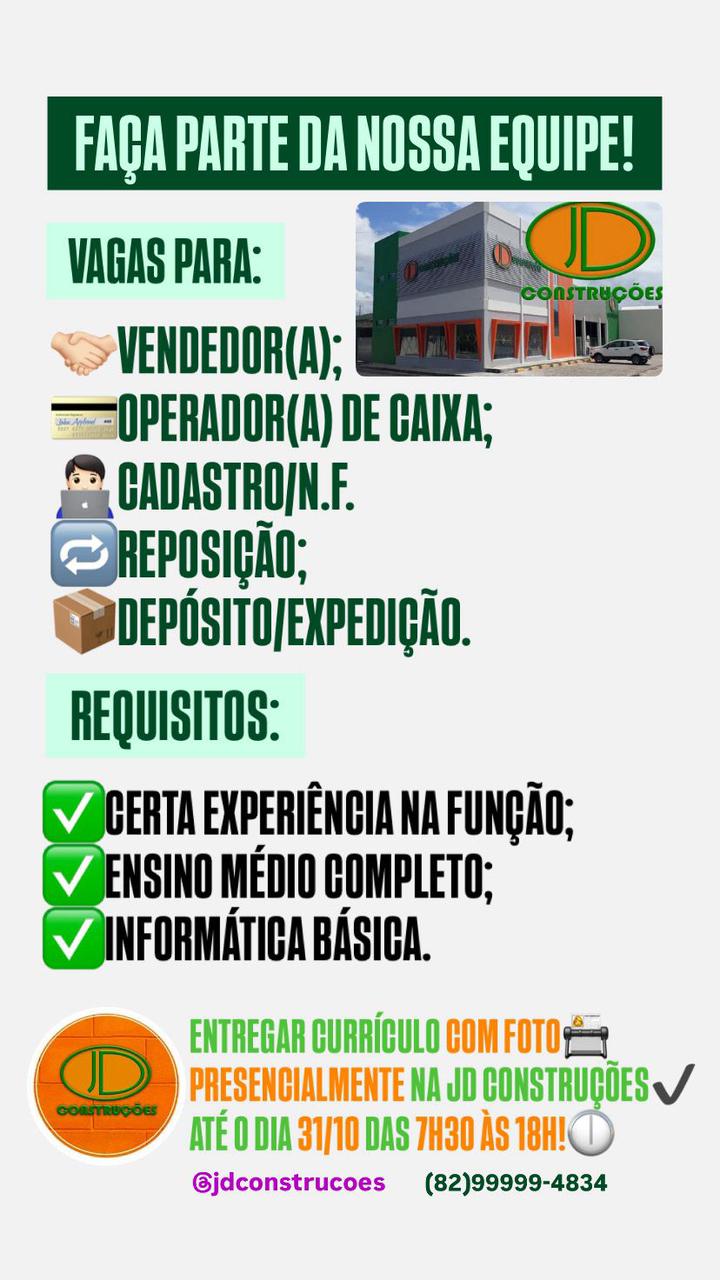 A JD Construções está com vagas abertas para ampliar sua equipe em Penedo. As oportunidades são para os cargos de vendedor, operador de caixa, cadastro/N.F., reposição e depósito/expedição.