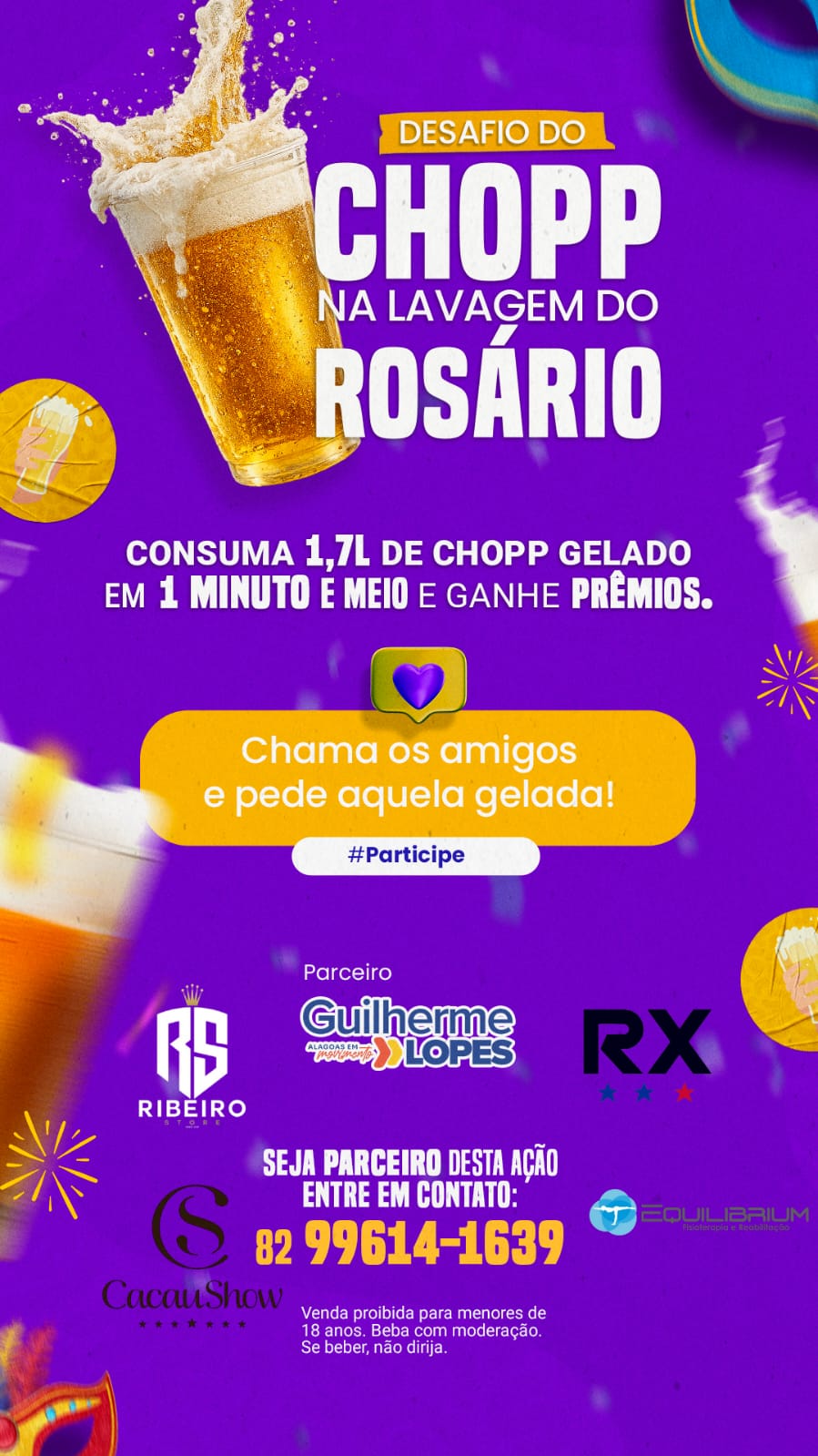 Empresários e interessados em apoiar o evento também podem se tornar parceiros. Para participar da ação, basta entrar em contato pelo telefone (82) 99614-1639. O Desafio do Chopp promete diversão, integração e um clima descontraído para o público presente.