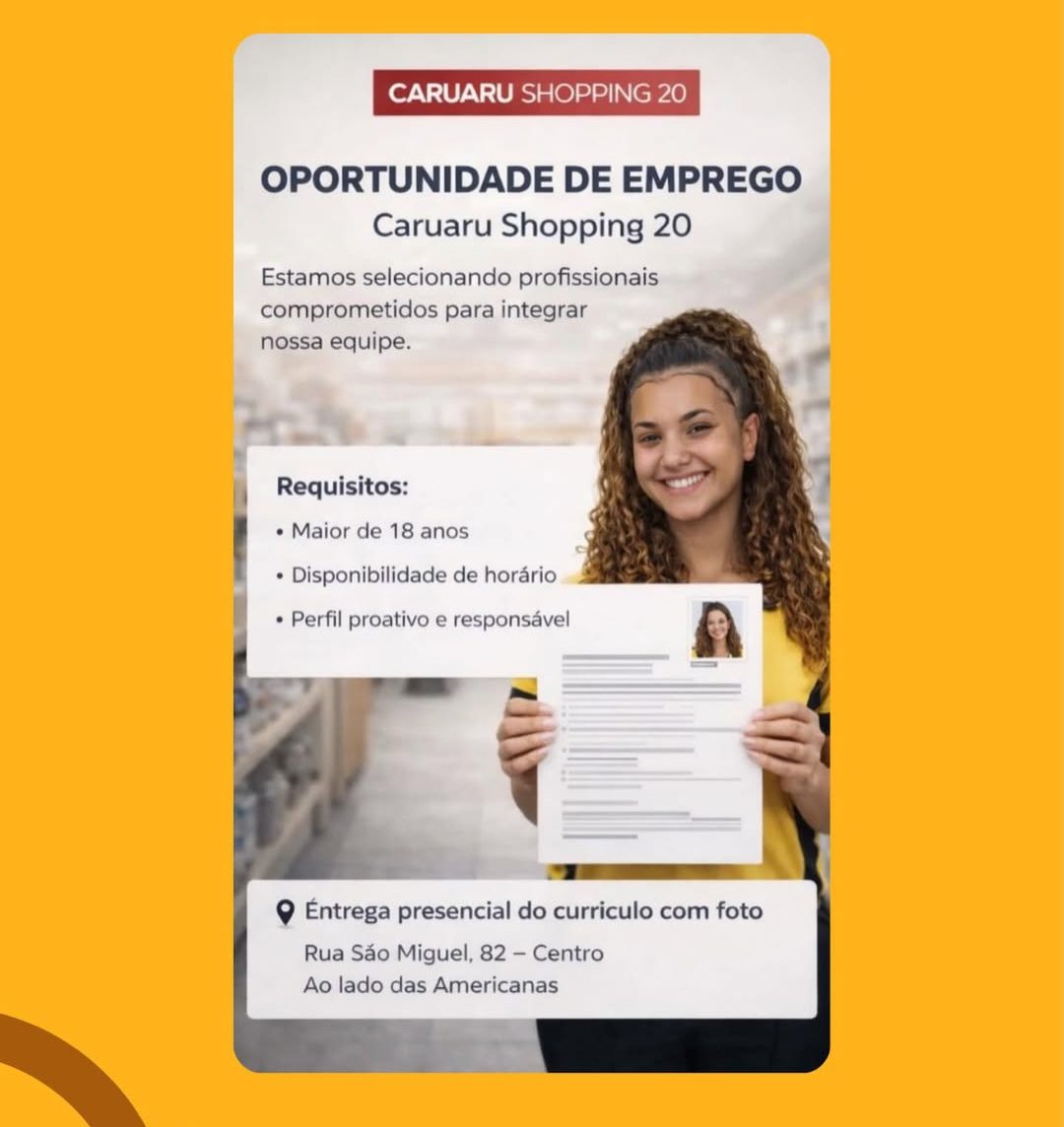 Se você está em busca de uma oportunidade para ingressar no mercado de trabalho, é importante ficar atenta para não perder essa chance. O Caruaru Shopping 20 abriu processo seletivo para atuação na loja localizada no Centro de Penedo.
