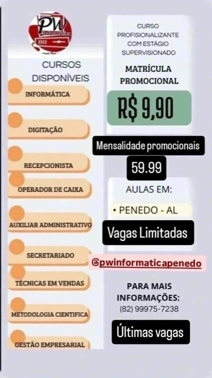 A PW Cursos está com inscrições abertas para uma nova turma de cursos profissionalizantes nas cidades de Penedo, povoado Cooperativa de 2º Núcleo e Igreja Nova, com opções voltadas para quem busca qualificação e ingresso no mercado de trabalho.