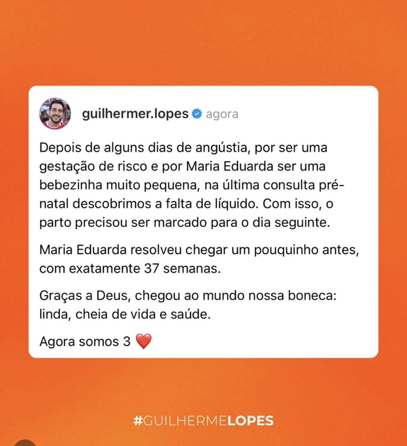 Em declaração publicada nas redes sociais, Guilherme Lopes relatou que a família enfrentou momentos de angústia nos dias que antecederam o parto. Segundo ele, Maria Eduarda apresentava um tamanho menor que o esperado e, na última consulta pré-natal, foi identificada a falta de líquido amniótico, o que levou a equipe médica a decidir pela antecipação do parto.