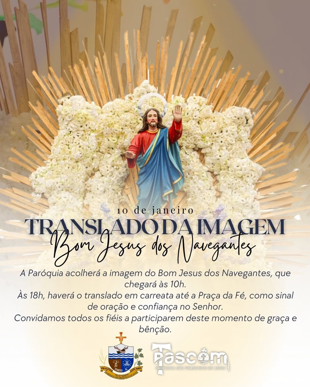 De acordo com a paróquia, a imagem do Bom Jesus dos Navegantes será acolhida às 10 horas, em um momento marcado por espiritualidade e devoção. Já às 18, será realizado o translado em carreata até a Praça da Fé, como sinal de oração e confiança no Senhor.