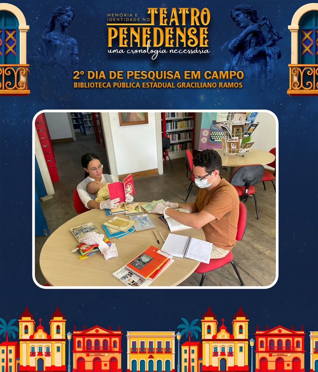 Na Biblioteca Pública Estadual Graciliano Ramos, em Maceió, a dupla elaborou, a partir de artigos de jornais da época, livros e documentos históricos, uma linha do tempo que revela histórias e curiosidades sobre o fazer teatral em Penedo, resgatando memórias que ajudam a compreender a trajetória cultural da cidade.