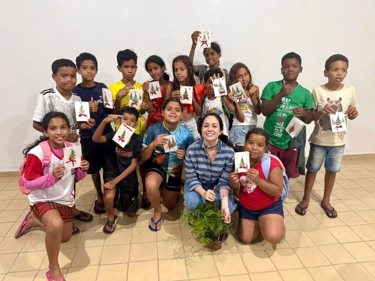 Nas escolas, Olga desenvolve a produção de cartões natalinos feitos com arte botânica, utilizando folhagens que remetem à árvore de Natal. O objetivo é permitir que cada aluno crie um cartão para presentear familiares e amigos, levando uma mensagem de fé e esperança para o período natalino.