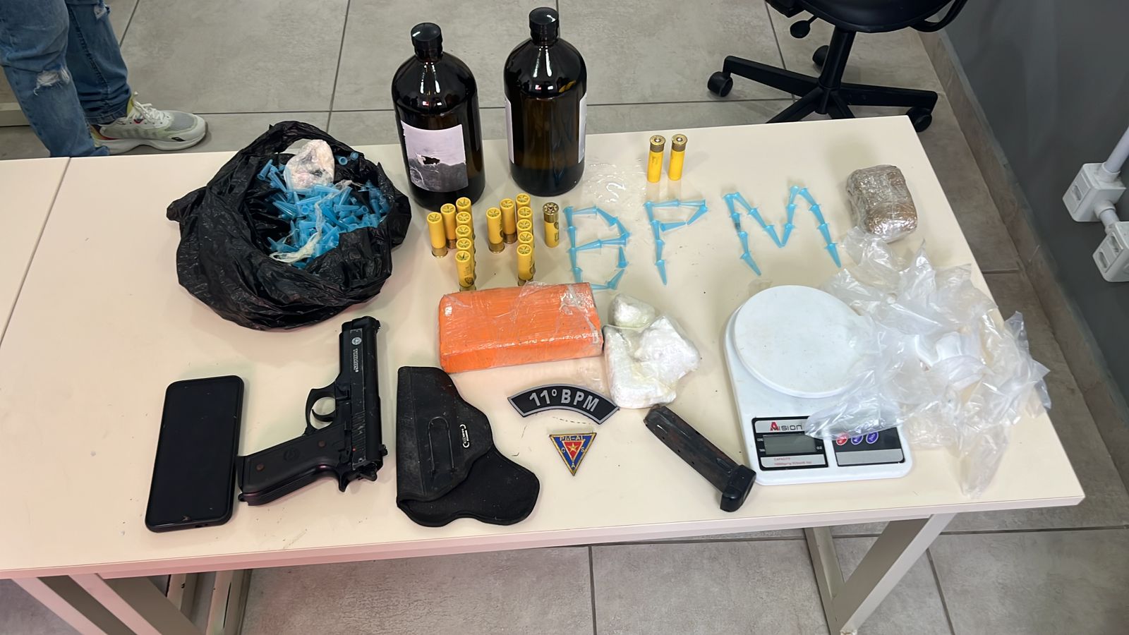 Além dos entorpecentes, foram apreendidas 17 munições calibre .20, duas munições calibre .380, um carregador de pistola do mesmo calibre, um simulacro de pistola calibre .40, uma balança de precisão, aproximadamente dois litros de líquido utilizado na fabricação de “loló” e um coldre para revólver.