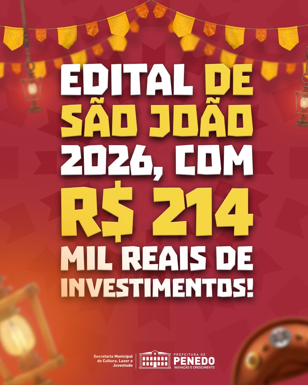 Com investimento total de R$ 214.000,00 em fomento cultural, o edital é voltado para artistas, grupos e produtores que mantêm viva a essência do São João nordestino. A ação contempla quadrilhas juninas, bandas de forró e pé de serra, trios tradicionais, grupos de coco de roda, além de representantes culturais de comunidades e bairros.