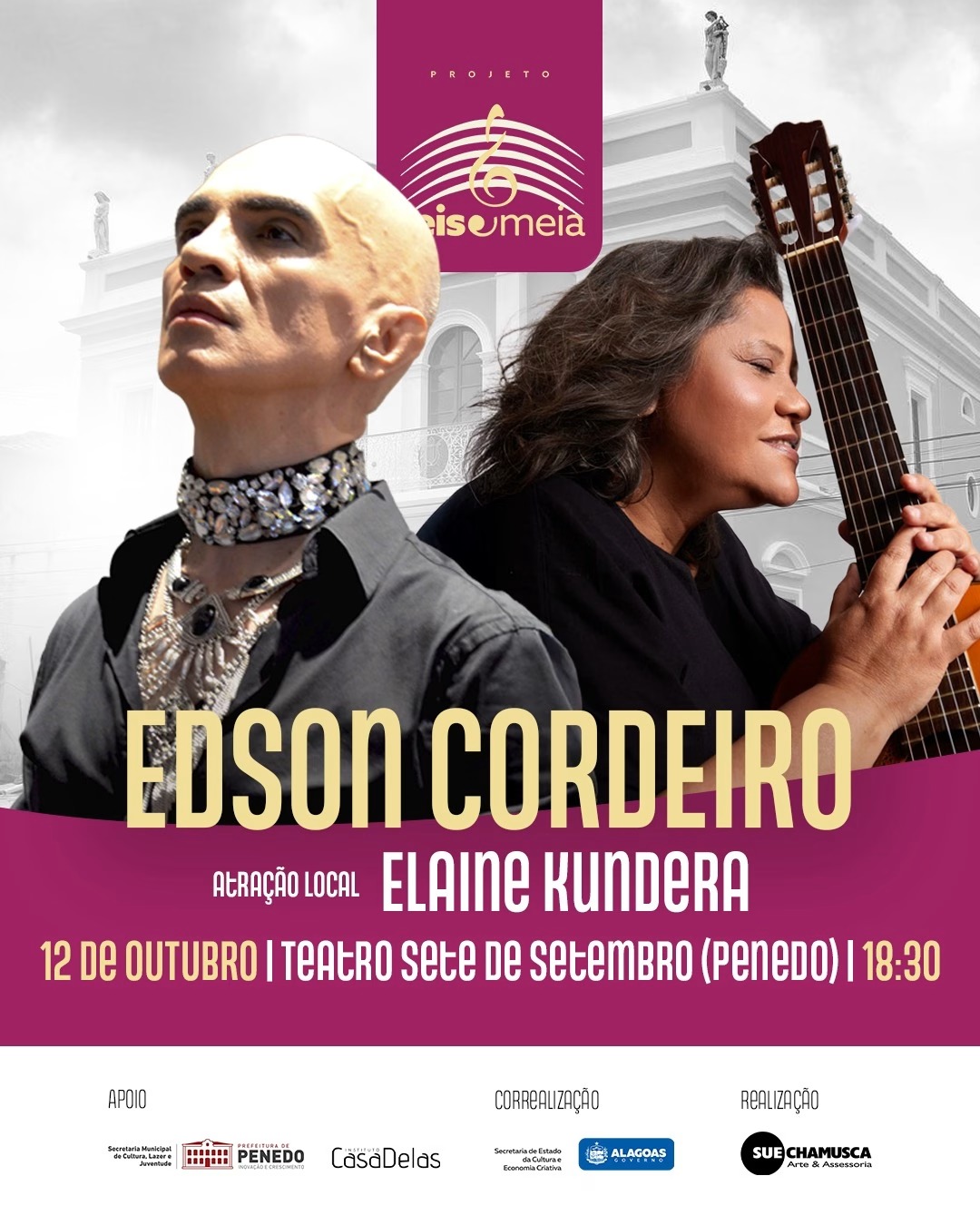O Projeto Seis & Meia desembarca em Penedo com o inédito show de um dos maiores intérpretes do Brasil: Edson Cordeiro. Ele estará no palco do Theatro Sete de Setembro no próximo domingo, 12 de outubro, a partir das 18h30, apresentação única com abertura de Elaine Kundera.