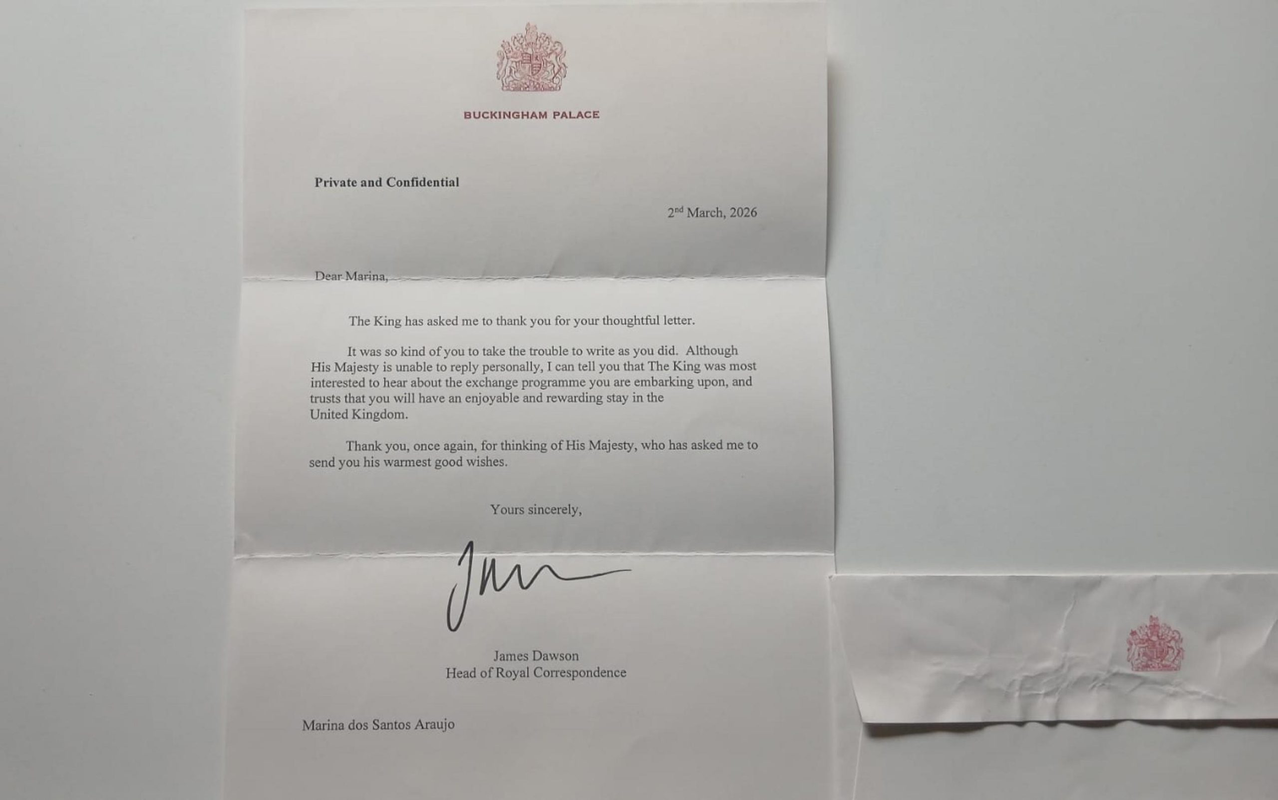 A mensagem, redigida pelo chefe da correspondência real, James Dawson, reflete a atenção e carinho da realeza ao responder à estudante alagoana, que o apresenta ao programa Daqui Pro Mundo, iniciativa do Governo de Alagoas que leva alunos da rede pública para um intercâmbio cultural e linguístico na Inglaterra.