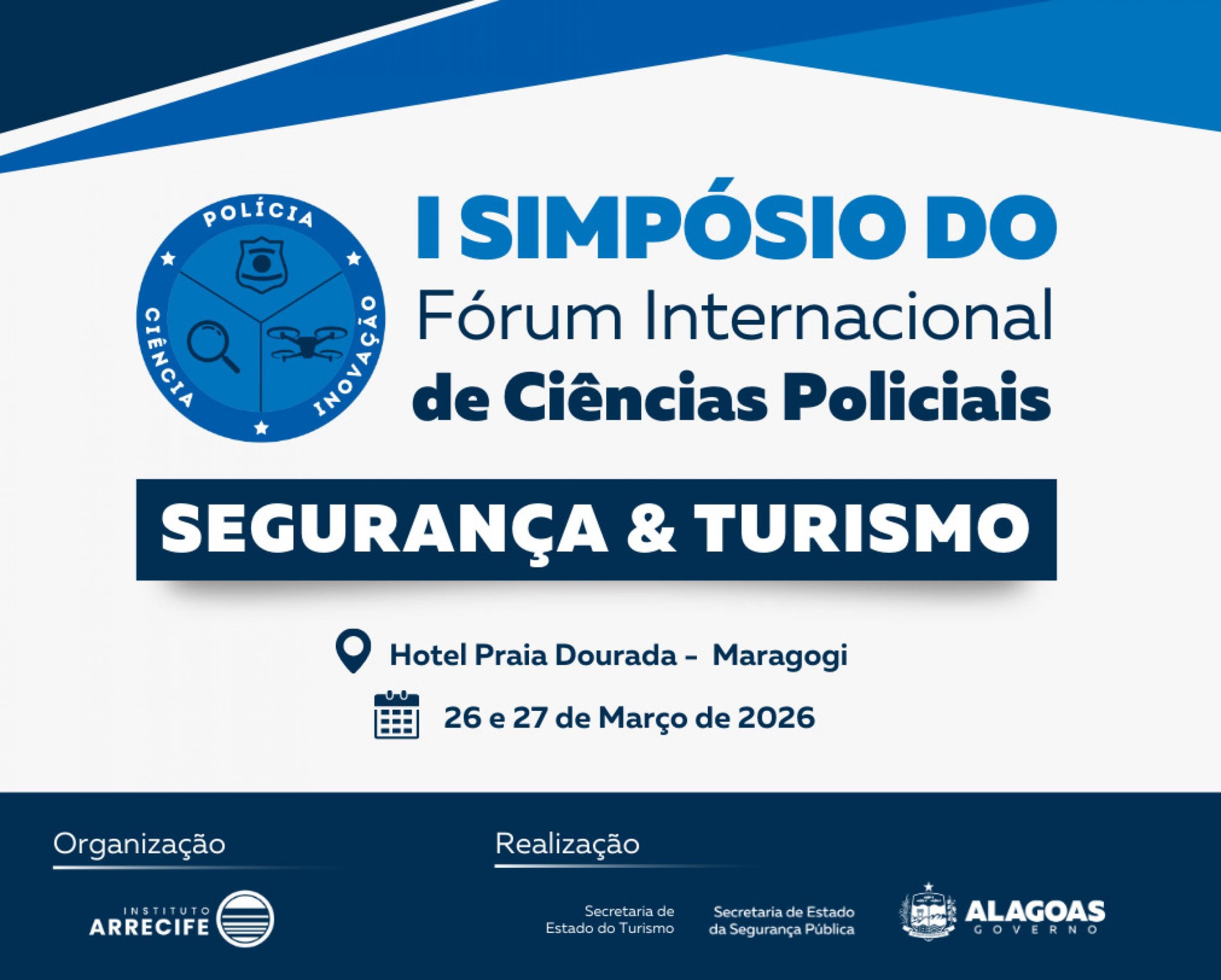 A Secretaria de Estado da Segurança Pública (SSP/AL), em parceria com a Secretaria de Turismo de Alagoas (Setur/AL) e o Instituto Arrecife, promove entre os dias 26 e 27 de março o I Simpósio do Fórum Internacional de Ciências Policiais – Segurança & Turismo. O evento coordenado pela Chefia Especial de Inteligência da SSP ocorrerá no auditório do Hotel Praia Dourada, em Maragogi.