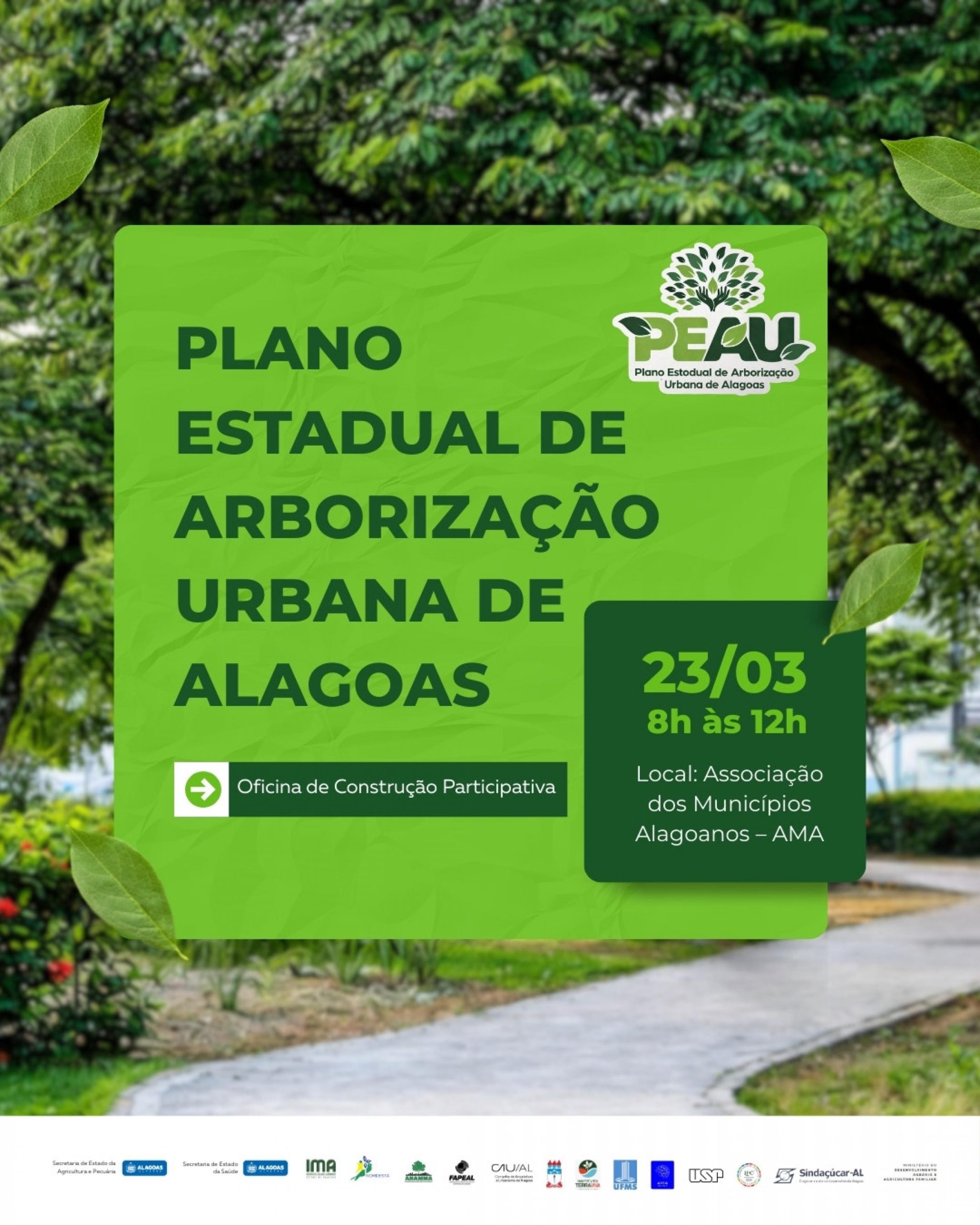 A Secretaria de Estado do Meio Ambiente e dos Recursos Hídricos de Alagoas inicia, na segunda-feira (23), no auditório da Associação dos Municípios Alagoanos (AMA), em Maceió, às 8h, a primeira oficina presencial do Plano Estadual de Arborização Urbana, reunindo representantes do Governo do Estado, universidades, Ministério Público e gestores municipais, com participação das secretarias de Meio Ambiente e Saúde, para apresentação do diagnóstico inicial, análise das vulnerabilidades ambientais e definição das bases técnicas que irão orientar a construção de cidades mais resilientes, saudáveis e preparadas para os desafios climáticos.